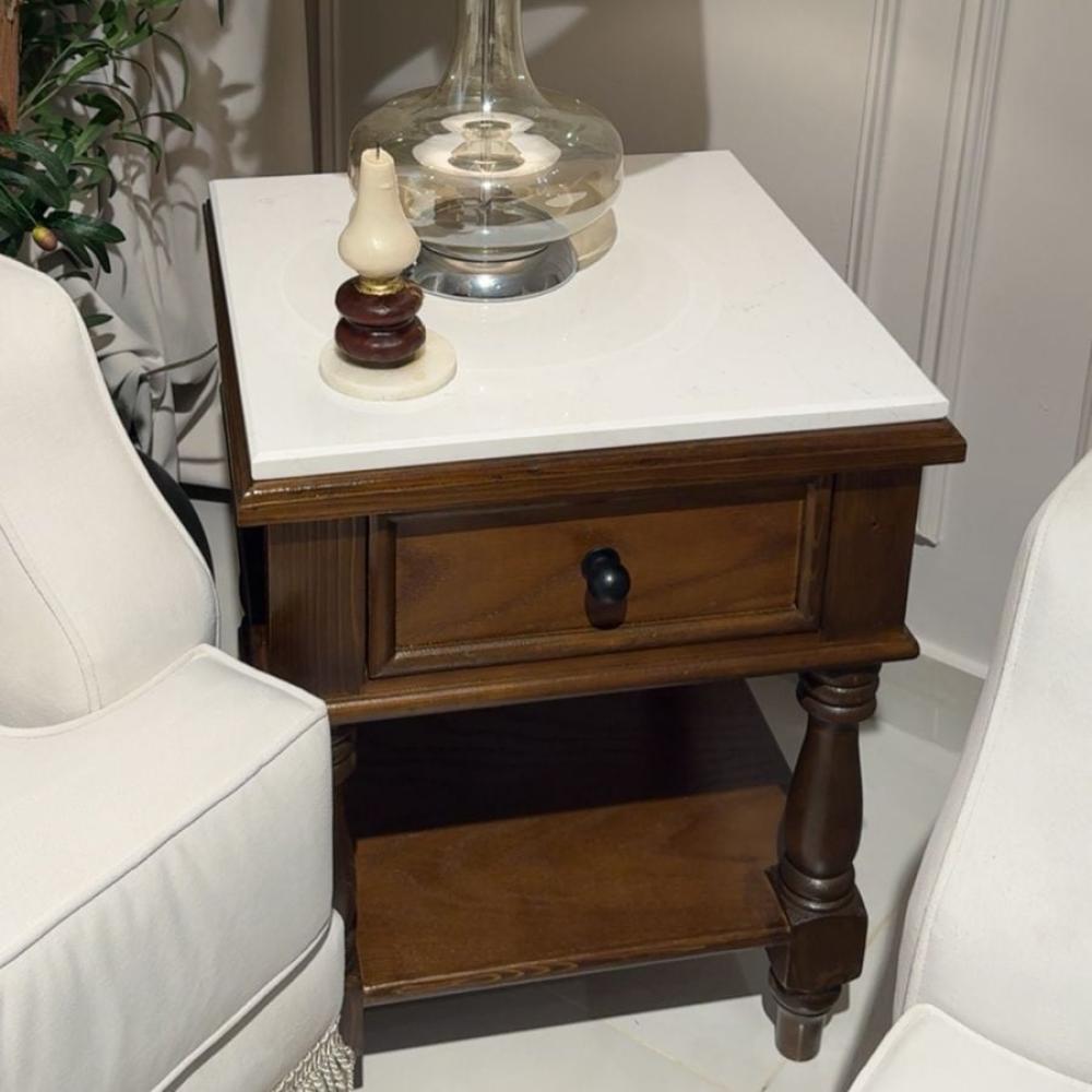 كومدينه رخام تجمع بين الأناقة والعملية. سطح رخام صناعي مقاوم للسوائل فوق خشب طبيعي أصيل يدوم معك طويلاً.